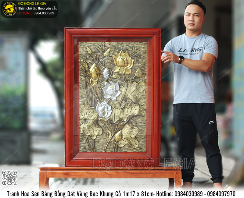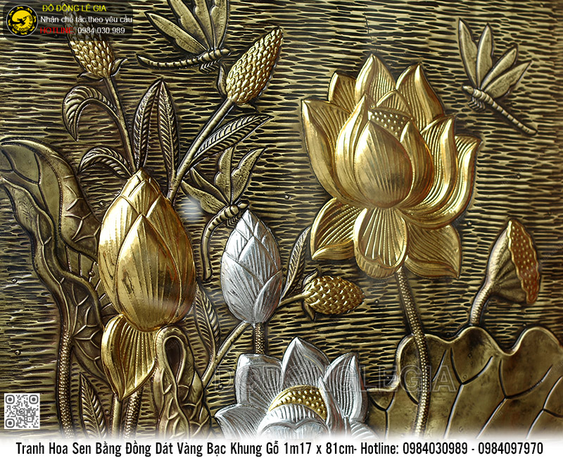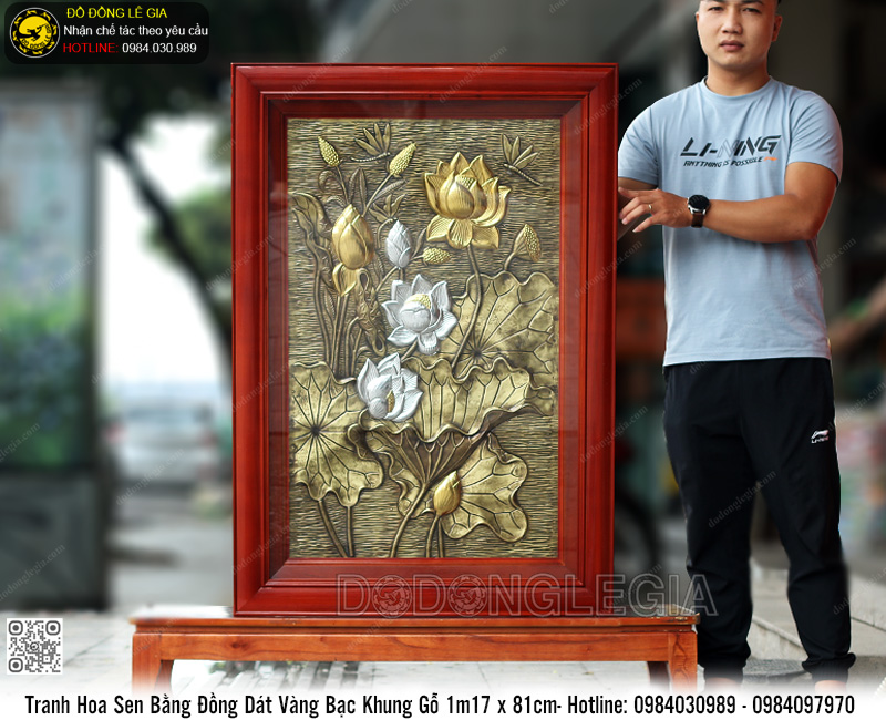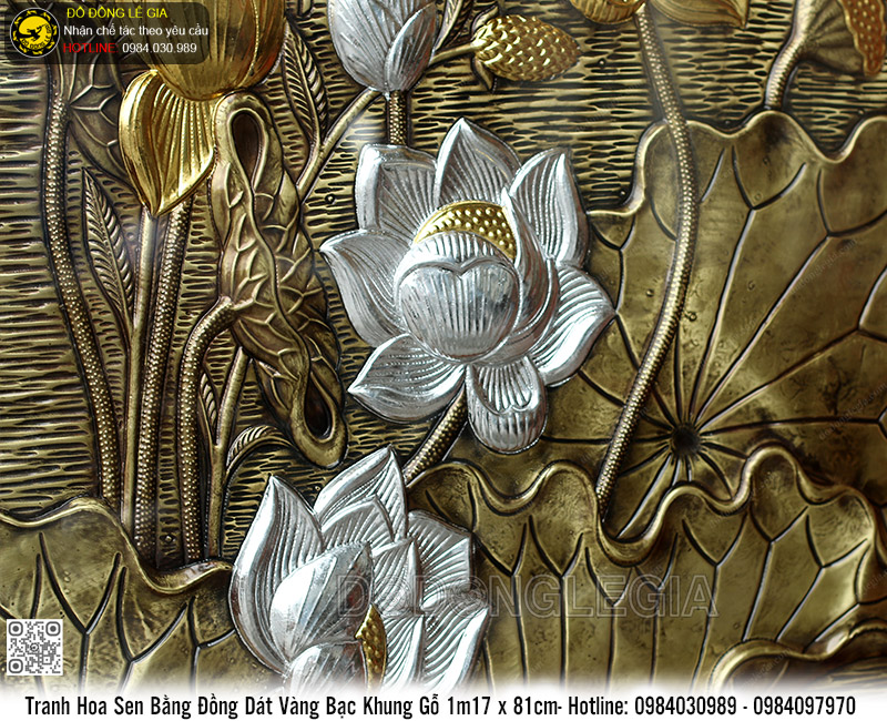 Tranh Hoa Sen Bằng Đồng Dát Vàng Bạc Khung Gỗ 1m17 x 81cm